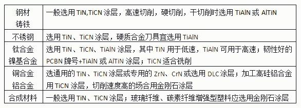 就PVD涂层的选用提出三点。首先,还是要根据工件材料的分类及硬度。加工钢和铸铁一般用通用的TiN、TiCN、硬度搞得可用TiAlN;加工不锈钢选用抗粘结的、导热性好的涂层;加工钛合金、镍基合金等难加工材料,切削温度高,要选耐热性好、耐氧化温度高的TiAlN、AlTiN等涂层;加工铜除通用的TiN外可选用CrN涂层;加工高硅铝合金要用耐磨粒磨损的涂层如TiCN;加工合成材料应选金刚石涂层或TiN、TiCN涂层。